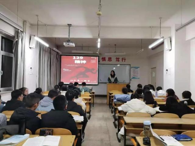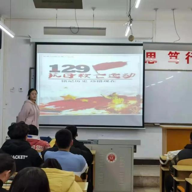 各班主持人带领同学们齐唱团歌。主题团日活动开始,各班主持人以PPT、历史照片以及相关视频和歌曲为媒介,向同学们详细讲述了“一二•九运动”爆发的历史背景、运动过程、运动成果等。让同学们更加深刻地了解当时日本帝国主义侵略中国,并吞华北的阴谋,深刻感受当时中国人民反抗侵略的决心和意志。同学们对主持人提出的关于“一二•九”的相关历史问题进行自由讨论发言。潜移默化地培养了同学们的爱国素养。随后大家共同阅读了爱国主义经典文学名著《青春之歌》,该书以“一二九”这一历史时期为背景,展现革命青年典型形象。最后,主持人做总结发言。