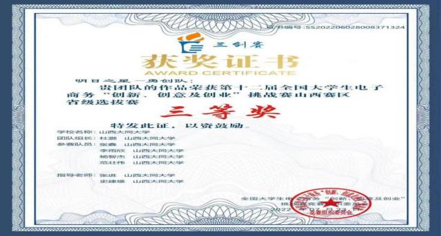 5月28日,第十二届全国大学生电子商务“创新、创意及创业”(即“三创赛”)挑战赛山西赛区省级选拔赛落下帷幕。我院“明日之星—勇创队”的作品《艾草堂》在第十二届全国大学生电子商务“创新、创意及创业”挑战赛山西赛区省级选拔赛中荣获“三等奖”。
