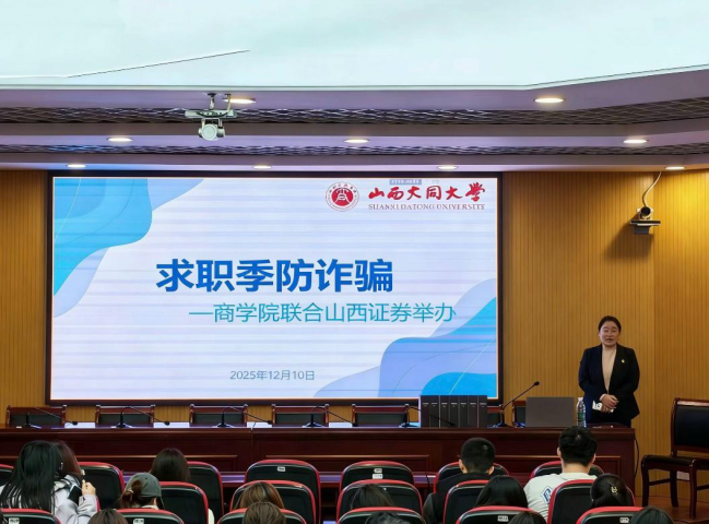 为切实筑牢2026届毕业生求职安全防线,助力学子规避求职风险、平稳衔接职场,2025年12月10日,304永利集团联合山西证券股份有限公司大同分公司在行知楼230教室举办“求职季防诈骗”知识讲座。