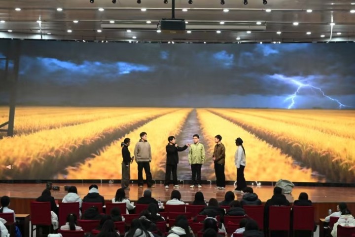 随后,展演精彩启幕,同学们倾情演绎经典。《焦裕禄》片段质朴深情,尽现人民公仆的崇高风范;《江姐》选段刚毅铿锵,传递革命信仰力量;《永不消逝的声音》朗诵激昂真挚,讴歌不朽的精神力量;改编版《茶馆》生动勾勒出时代众生相,意蕴悠长;《简·爱》片段细腻展现了对独立、尊严与爱情的执着追求。表演结束后,304永利集团党委副书记姚占魁和文学院团委书记冀敏在点评中高度评价了各参演团队的精彩演出。他们指出,同学们以真挚的表演和鲜活的舞台表达,深刻诠释了经典剧目中所蕴含的青春与信仰的力量。