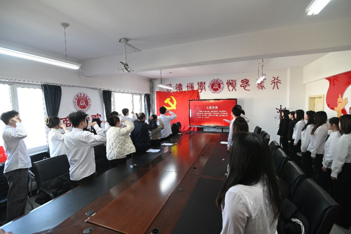 仪式在庄严的《国际歌》和《国歌》声中拉开帷幕。罗晓晨首先宣读了本次新发展的预备党员名单。随后,在领誓人的带领下,全体预备党员面向党旗肃立,举起右拳,以洪亮而坚定的声音庄严宣读入党誓词,铮铮誓言彰显了他们对党的忠诚以及为共产主义事业奋斗终身的决心。宣誓完毕后,与会领导与老师为预备党员们逐一佩戴党员徽章。徐苗受学院党委委托,为预备党员送上寄语。她结合高校学生党员的使命担当,勉励大家珍惜党员身份,在学习、工作和生活中时刻发挥先锋模范作用,以实际行动践行入党誓词。